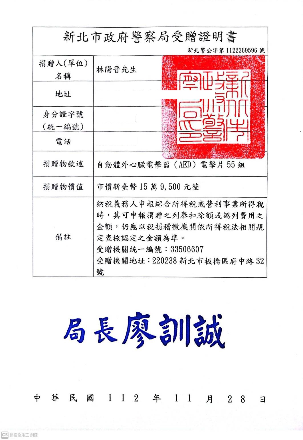 酒匯國際股份有限公司捐贈本局自動體外心臟電擊器(AED)電擊片55組,依公益勸募條例公告